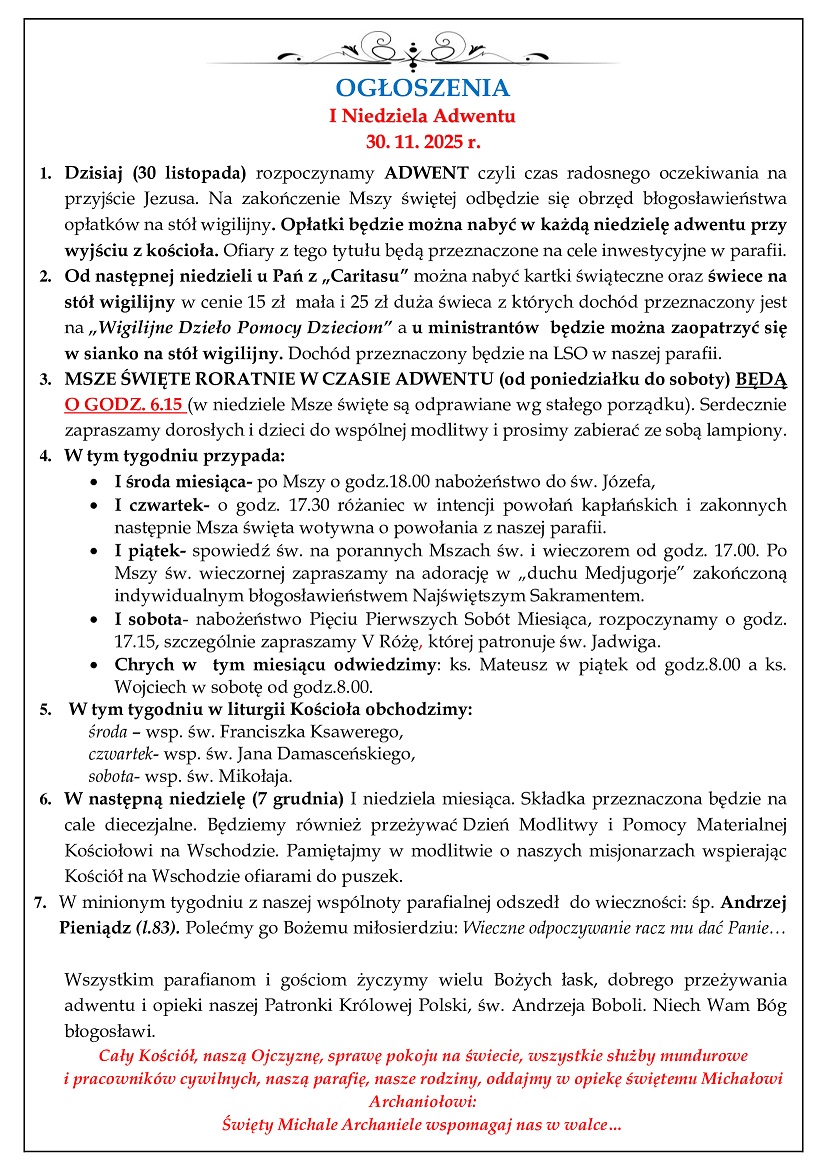 30 listopada - 1 Niedziela Adwentu